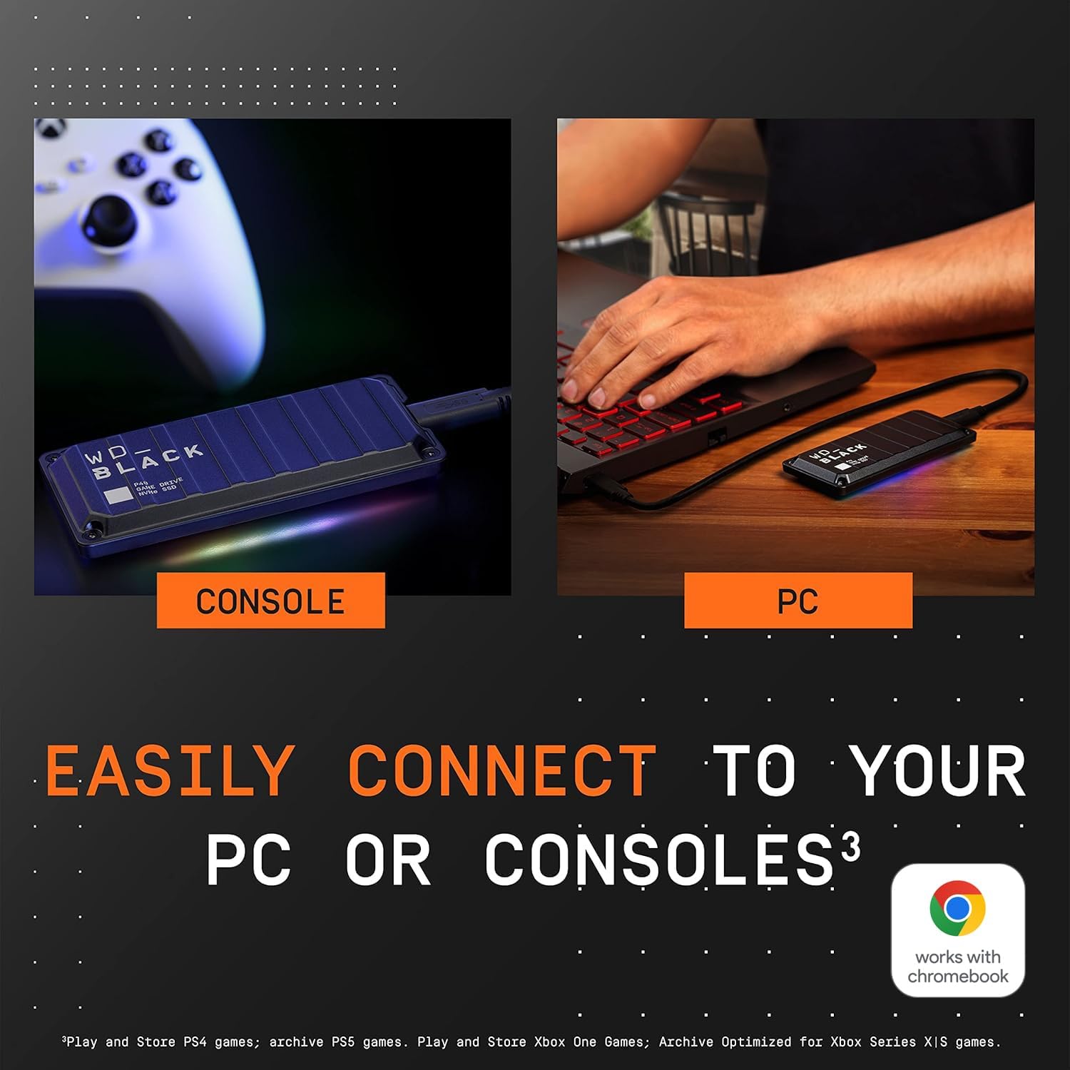 سازگار با کنسولهای PlayStation 5 و Xbox Series X|S. {سازگار با PlayStation 4 Pro یا PS4 با نسخه نرمافزار سیستم 4.50 یا بالاتر، PlayStation 5 (بازیها PS4 را پخش و ذخیره کنید؛ بازیهای PS5 را بایگانی کنید)، Xbox One و Xbox Series X|S (بازیها Xbox One را پخش و ذخیره کنید؛ بازیهای Xbox Series X|S را بایگانی کنید)
