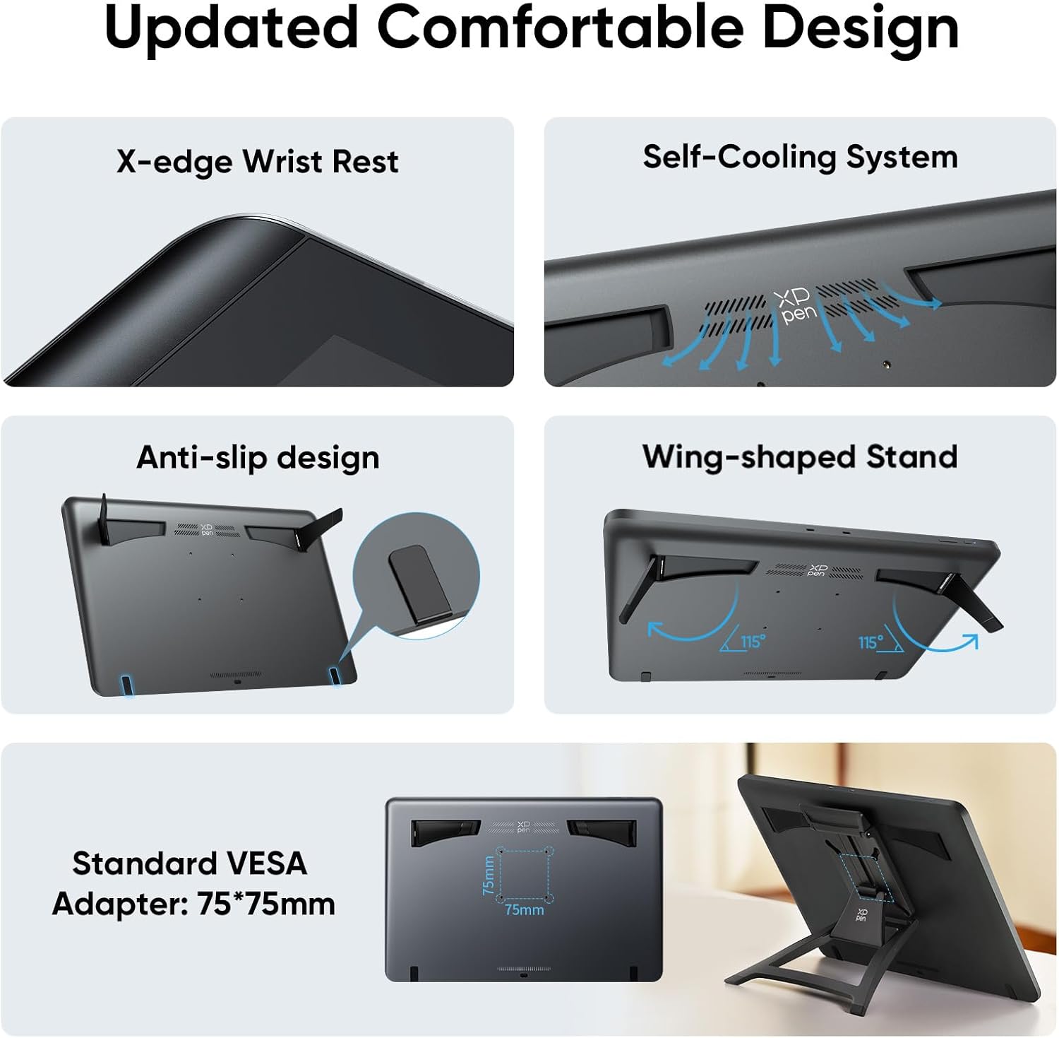 هر دو کابل USB-C می توانند نمایشگر طراحی شما را به لپ تاپ یا تبلت شما متصل کنند و نیاز به کابل های متعدد را کاهش دهند و به سازماندهی دسکتاپ شما کمک کنند. علاوه بر این، آداپتور استاندارد VESA (75×75 میلی متر) گزینه های نصب همه کاره را ارائه می دهد، در حالی که پایه بال شکل قرارگیری پایدار را تضمین می کند.