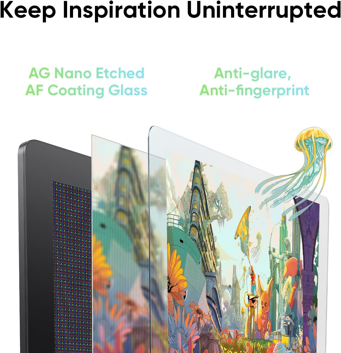 شیشه حکاکی شده AG تابش خیره کننده را به حداقل می رساند و به هنرمندان و طراحان کمک می کند تمرکز خود را در جلسات طولانی حفظ کنند. روکش ضد اثر انگشت سطح را برای استفاده بهتر تمیز نگه می دارد. حکاکی در مقیاس نانو از نقاط فلاش پیکسلی برای یک تجربه بصری صاف جلوگیری می کند، در حالی که لایه بندی کامل اختلاف منظر را کاهش می دهد و باعث می شود طراحی بصری تر و شبیه کاغذ باشد.