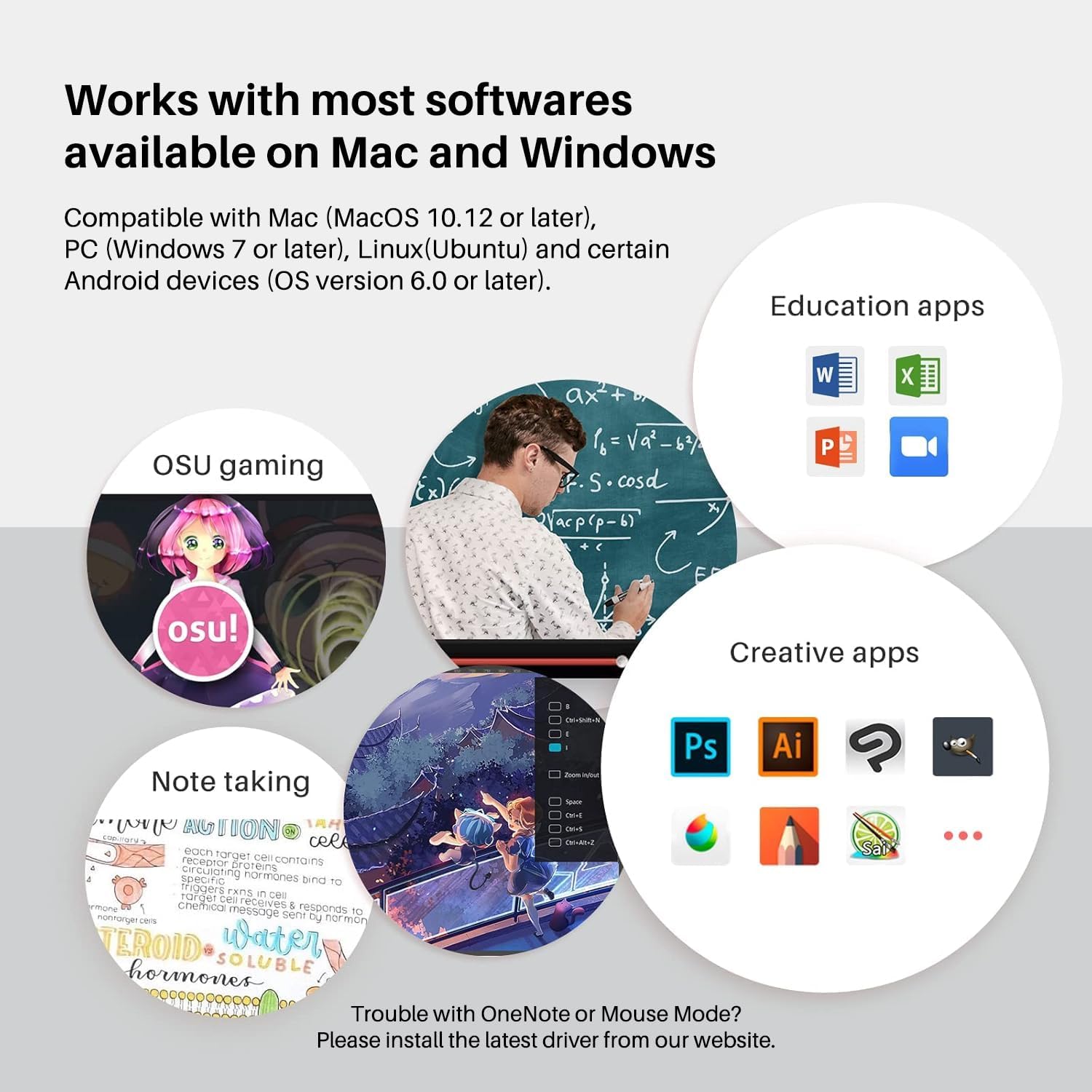 تبلت نقاشی دیجیتال Inspiroy 2 با مک (MacOS 10.12 یا بالاتر)، کامپیوتر شخصی (ویندوز 7 یا بالاتر)، لینوکس (اوبونتو) و برخی از دستگاههای اندروید (سیستم عامل نسخه 6.0 یا بالاتر) سازگار است.