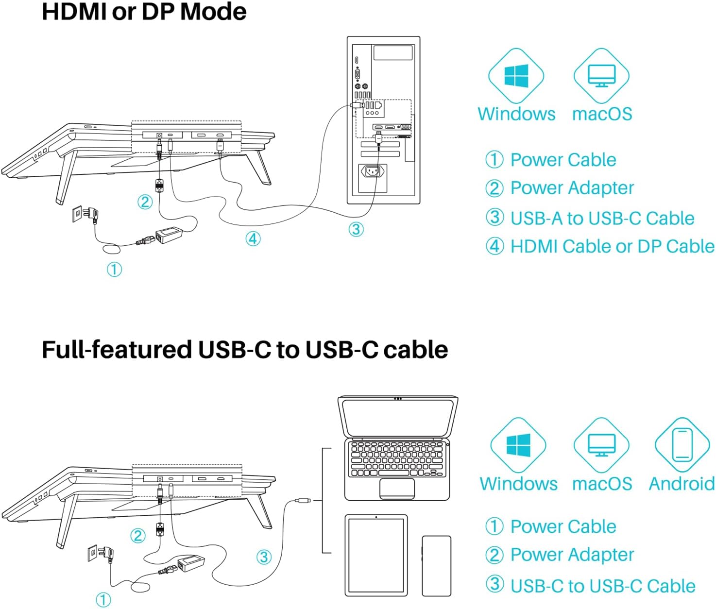 مانیتور گرافیکی Kamvas Pro 24 4K از سیگنال های HDMI و DP پشتیبانی می کند، شما به راحتی می توانید آن را به دسکتاپ، رایانه شخصی یا مک خود متصل کنید. علاوه بر این، میتوانید از کابل USB-C به USB-C برای اتصال لپتاپ یا دستگاههای اندرویدی خود استفاده کنید، لطفاً مطمئن شوید که درگاه USB-C دستگاههای شما باید از استانداردهای USB 3.1 Gen1، DP 1.2 و بالاتر پشتیبانی کند.