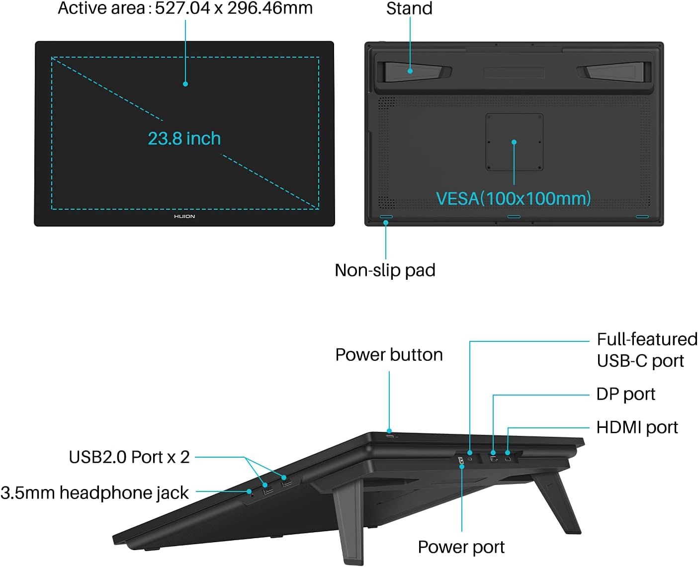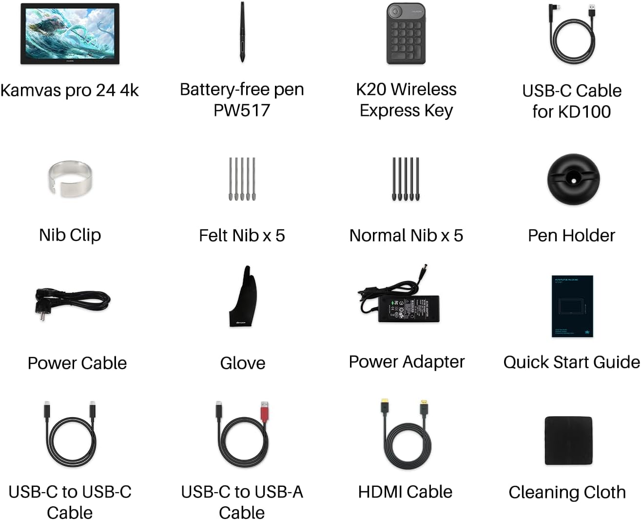 نمایشگر قلم 4K Kamvas Pro 24 مجهز به پایه فلزی یکپارچه 20 درجه برای کمک به طراحی است. در همین حال، دارای سوراخ vesa در پشت برای بازوی مانیتور (شامل نمی شود). نوک های نمدی جدید دارای ضربه قلم پایدارتر و اصطکاک قوی تر هستند تا قلم را بیشتر شبیه به یک خودکار واقعی کنند. با مینی کلید KD100 می توانید میانبرهای مورد استفاده خود را برای کارآمدتر کردن کار برنامه ریزی کنید.