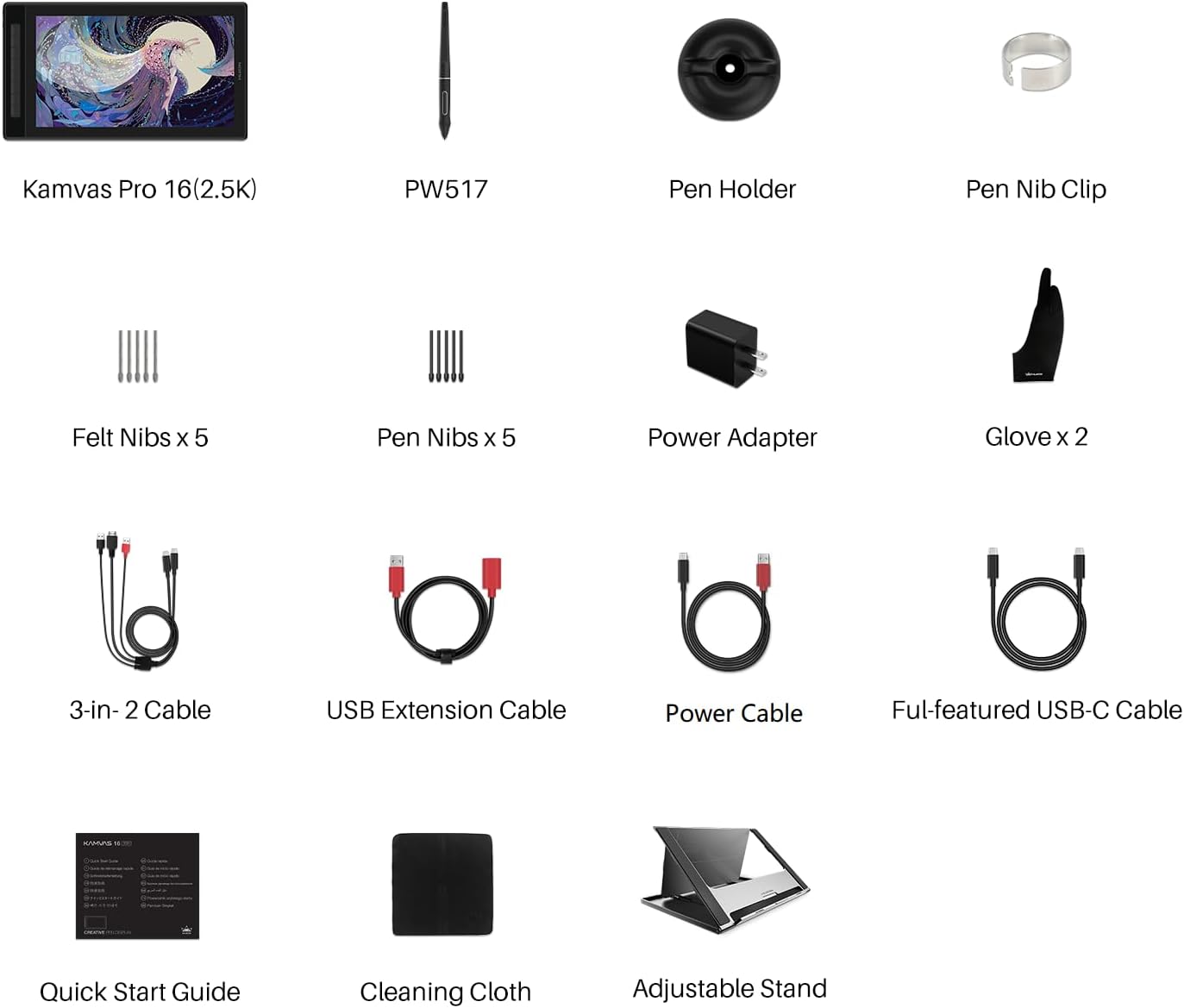 یک پایه قابل تنظیم نیز در این محصول گنجانده شده است تا بتوانید به سرعت موقعیت دلخواه خود را برای راحتی در تمام طول روز پیدا کنید. به جز نوکهای استاندارد، این محصول با 5 نوک نمدی نیز ارائه میشود تا نیازهای خلاقانه مختلف را برآورده کند. دستکش طراحی، جا قلمی، کابل رابط… هر آنچه نیاز دارید در این مجموعه گنجانده شده است. Kamvas Pro 16 (2.5K) ابزاری خلاقانه است که میتوانید با آن پاسخ دهید.