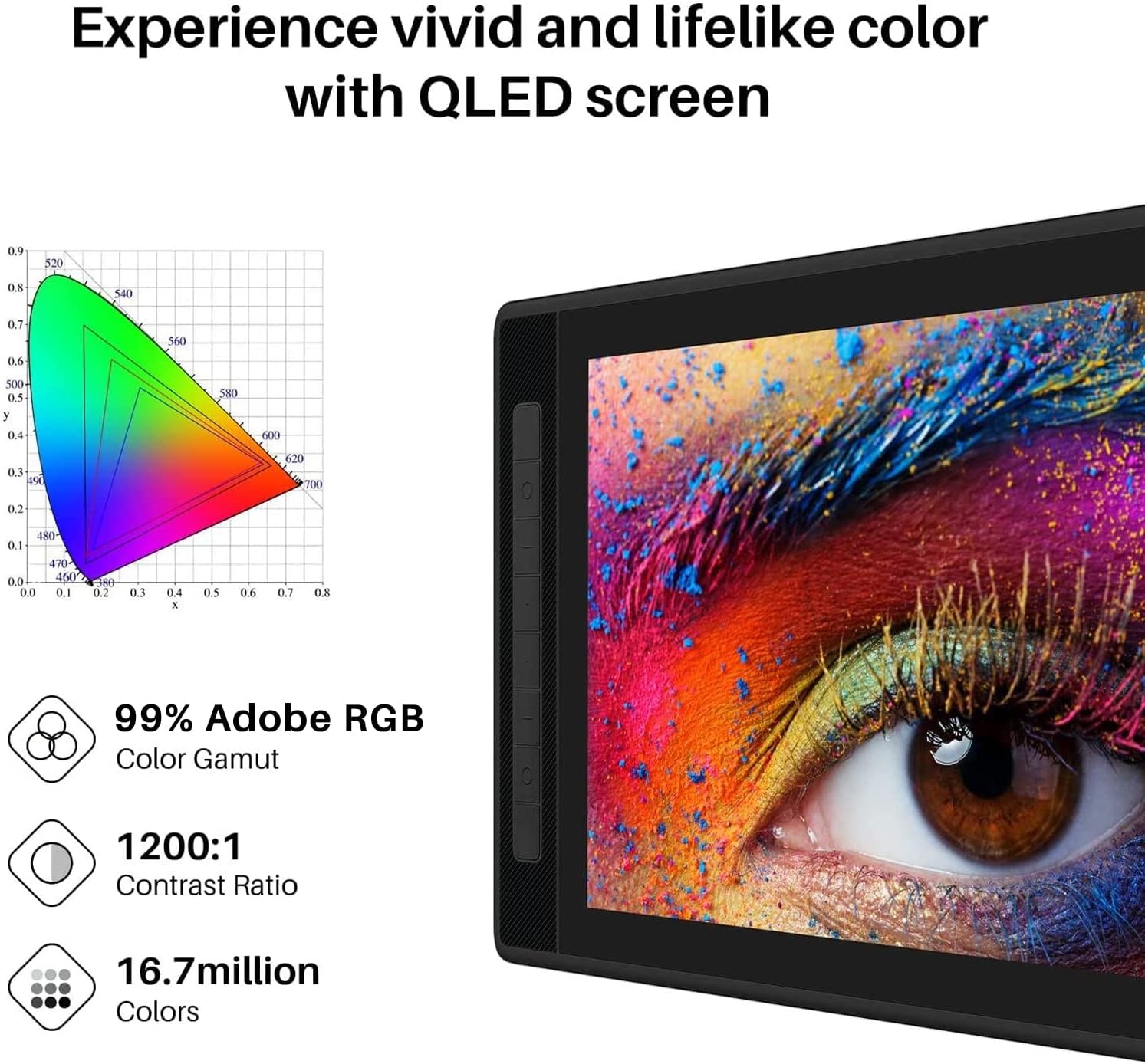 با بهرهگیری از فناوری Quantum Dot، تبلت طراحی Kamvas Pro 16 (2.5K) قادر به ارائه 16.7 میلیون رنگ با 99٪ طیف رنگی Adobe sRGB و نسبت کنتراست بالای 1200:1 است که درجهبندی و دقت رنگ روان را تضمین میکند. این تبلت میتواند نیازهای مشاغل خلاق، از ویرایش عکس و ویدیو گرفته تا طراحی گرافیک که به دنبال مانیتور گرافیکی با دقت رنگ بالا هستند را برآورده کند. هر قطعه از محتوا را میتوان دقیقاً با رنگی که سازندگان در نظر دارند، نمایش داد.