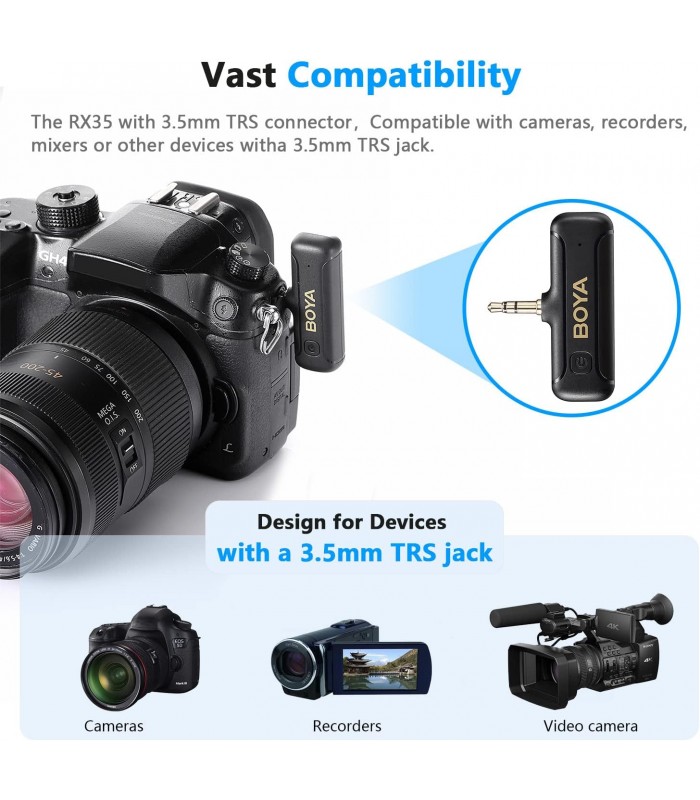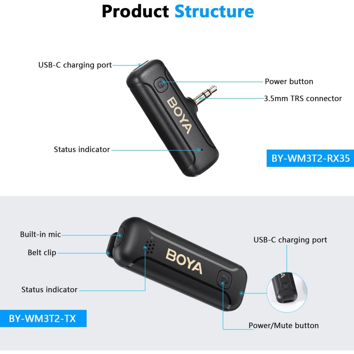 میکروفون بیسیم BY-WM3T2-M1 بویا از امواج بیسیم ۲.۴ گیگاهرتزی پشتیبانی میکند. این میکروفون میتواند صدای بسیار باکیفیتی را در اجراهای زنده اینترنتی، ولاگ، ضبط ویدیوهای آموزشی و سایر موقعیتها در اختیار بگذارد. این میکروفون دارای پورت ۳.۵ میلیمتری TRS است که با اکثر گوشیهای و دوربینها سازگاری دارد. این میکروفون همراه با یک فرستنده عرضه شده است.
