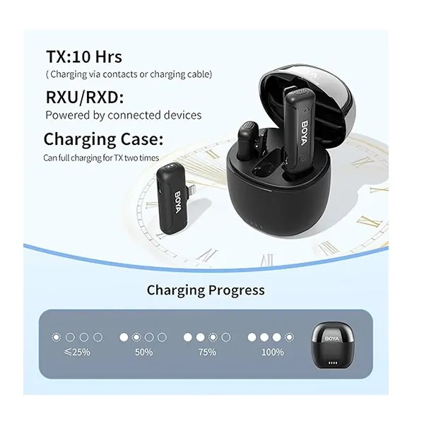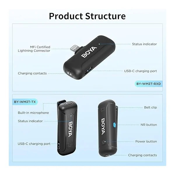 میکروفن بویا BY-WM3T-D2 یه باکس شارژ به ابعاد 52.8×65.8×72 میلیمتر داره که فرستنده و گیرنده، داخل اون قرار میگیرن. با این سایز باکس به راحتی میتونین اون رو هر جایی که میخواین ببرین و ازش استفاده کنین. گیرنده این محصول رابط لایتنینگ داره و این ویژگی نشون میده که فقط به گوشیهای اپل، آیپدها و مکبوکها وصل میشه و عملا کاربرهایی که گوشی اندروید دارن، نمیتونن از این محصول استفاده کنن.