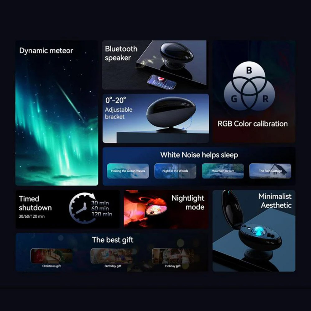 1. نورپردازی خیره‌کننده: این پروژکتور قادر است جلوه‌های نورپردازی مختلفی را ایجاد کند، که شامل تصاویری از ستارگان و کهکشان‌ها می‌شود. این جلوه‌ها می‌توانند فضایی آرام و دلنشین برای استراحت یا خواب ایجاد کنند.